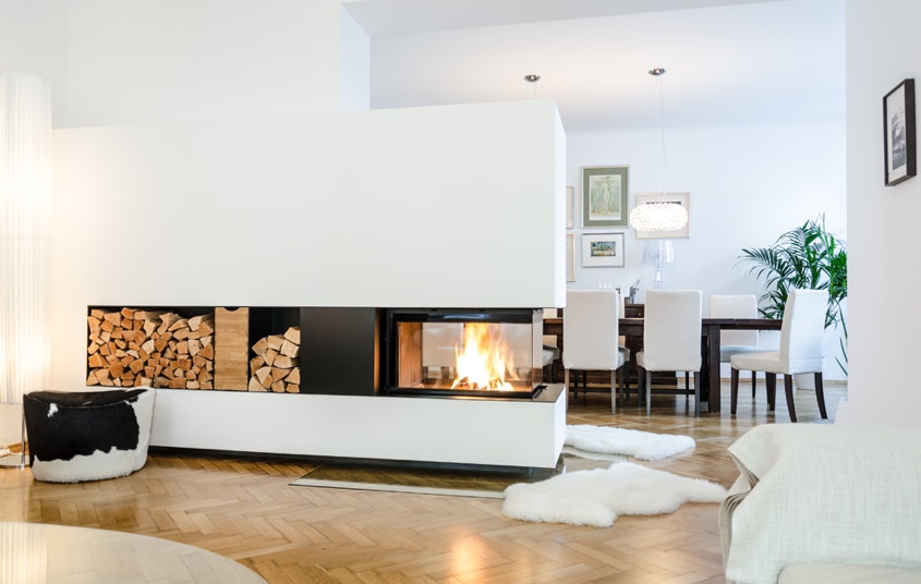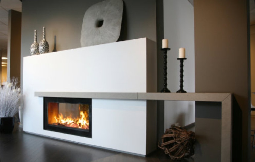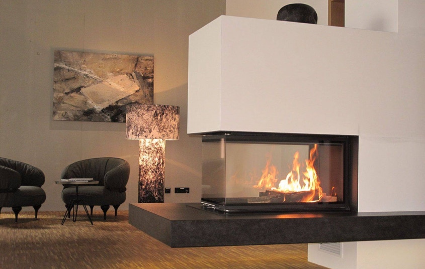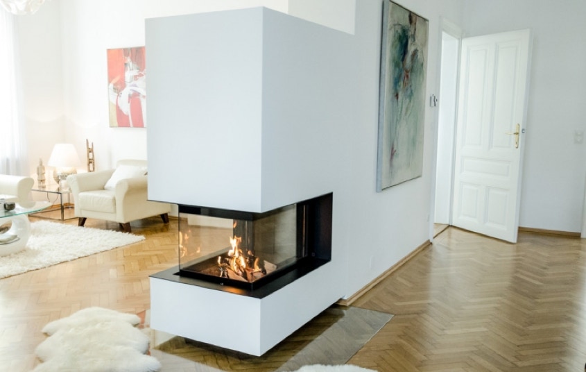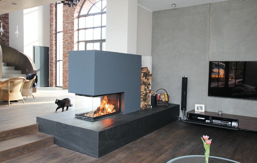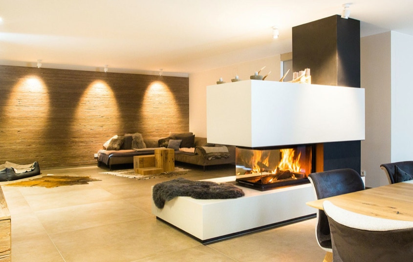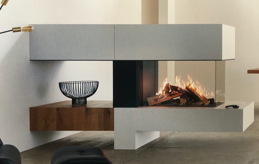 Der Heizkamin besteht aus einem Kamineinsatz, dieser kann beliebig gestaltet werden. Unter anderem auch als Raumteiler